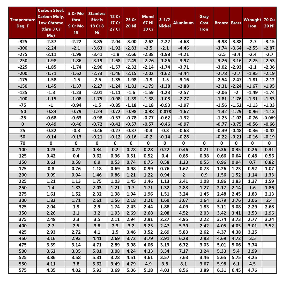 The linear thermal expansion between 70 degrees F and indicated temperature, inches per 100 feet
